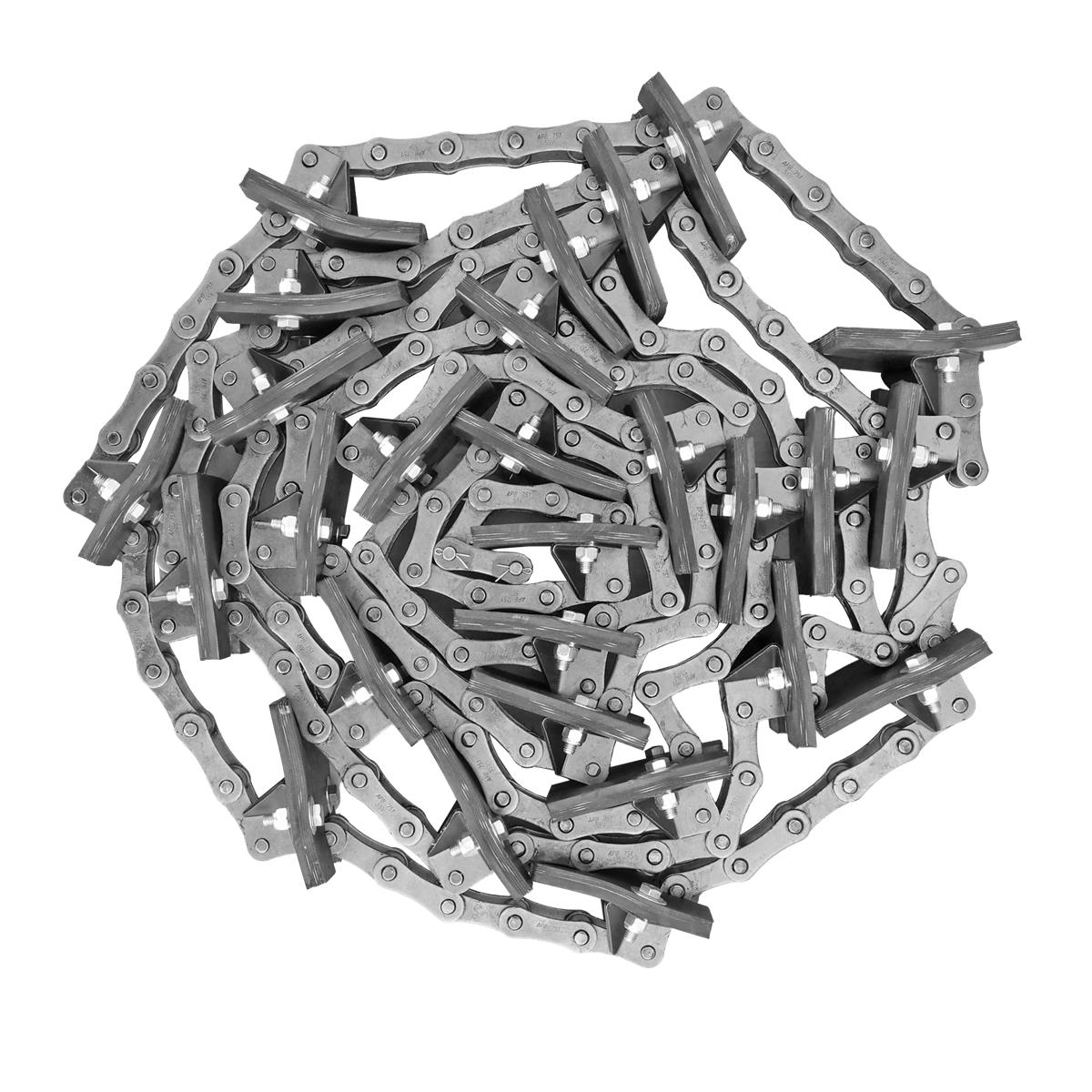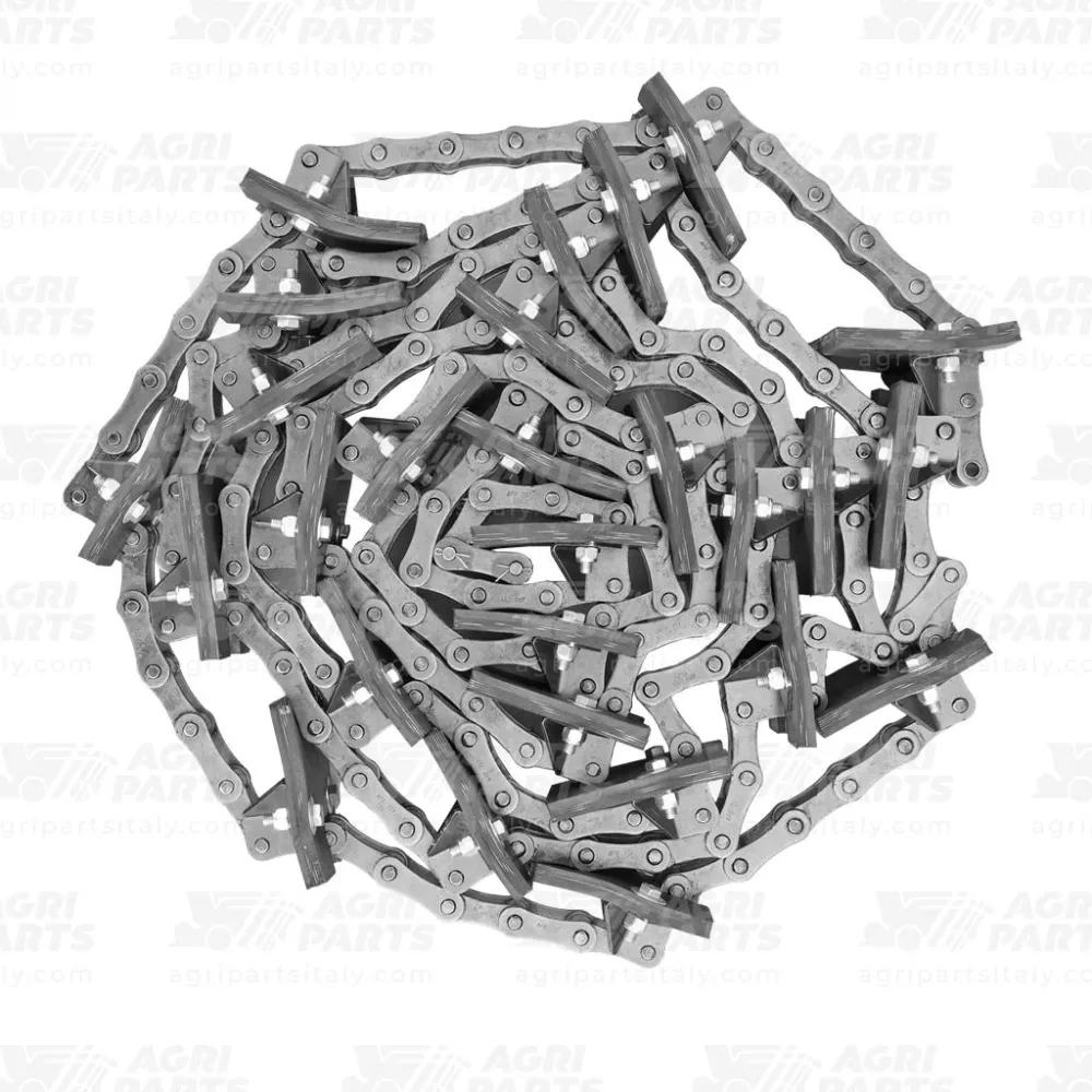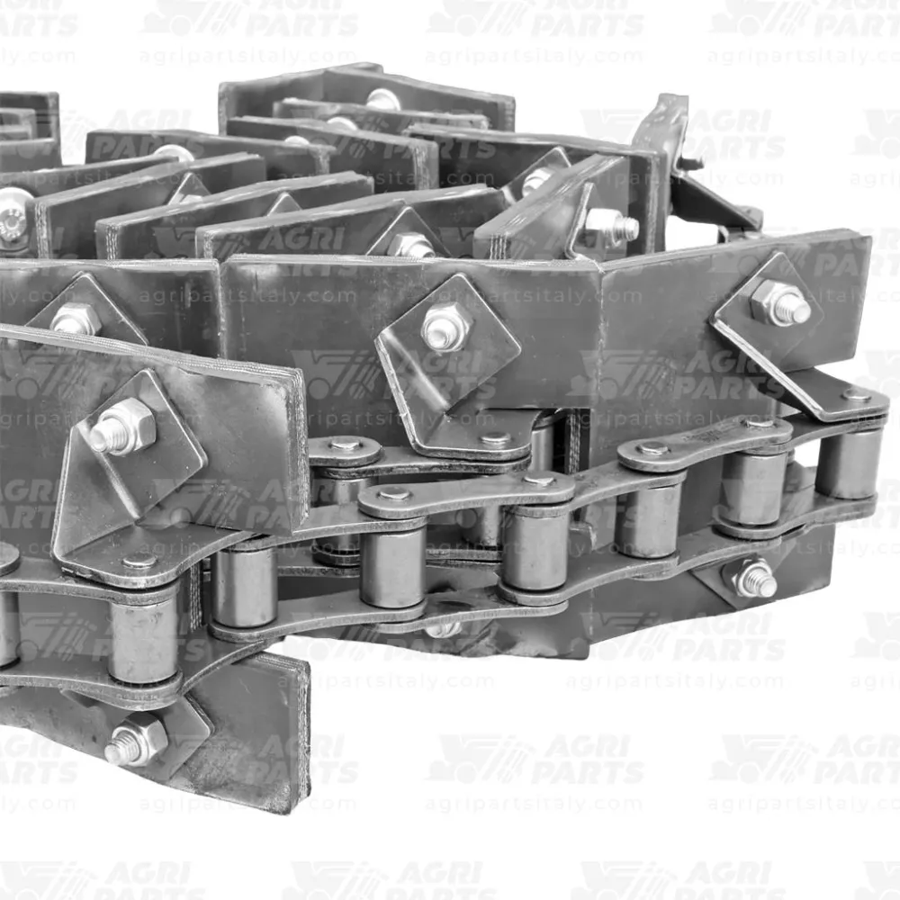 Komplette Montage der Elevator kette mit verschraubten Foerderplatten und 27 Anbauteilen für den Überkehrelevator an Mähdreschern der John Deere Serien 2000 und 2200. Montiert in Italien von Agri Parts, 100 % austauschbar mit dem Original. OEM Code AZ46269 (18AP009834).