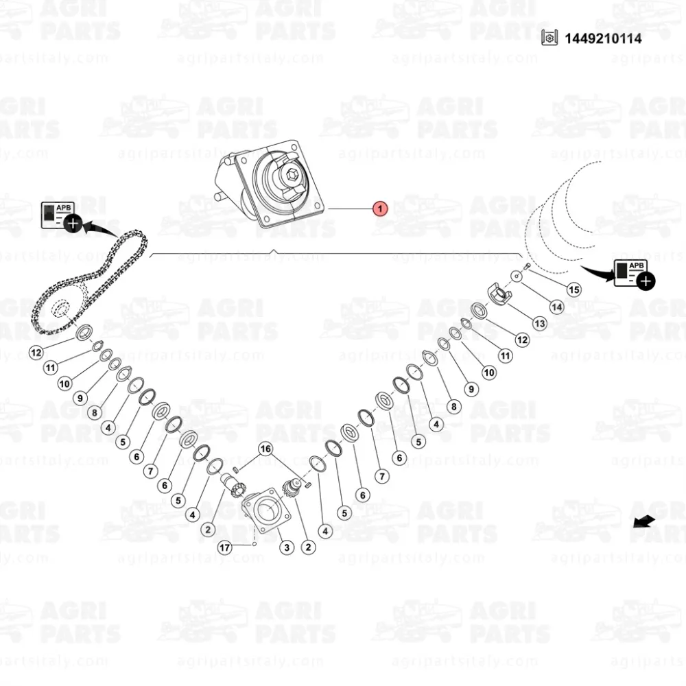 Scatola di trasmissione completa per l'azionamento coclea del carico / riempimento serbatoio per la raccolta della granella pulita su mietitrebbie New Holland. La scatola di marchio 'APB' - Agri Parts Bologna - e' intercambiabile al 100% con l'originale.